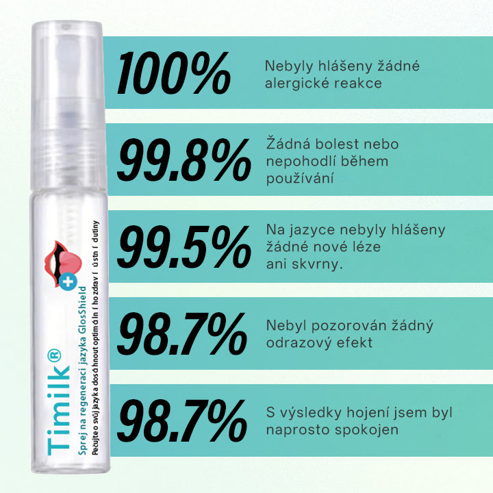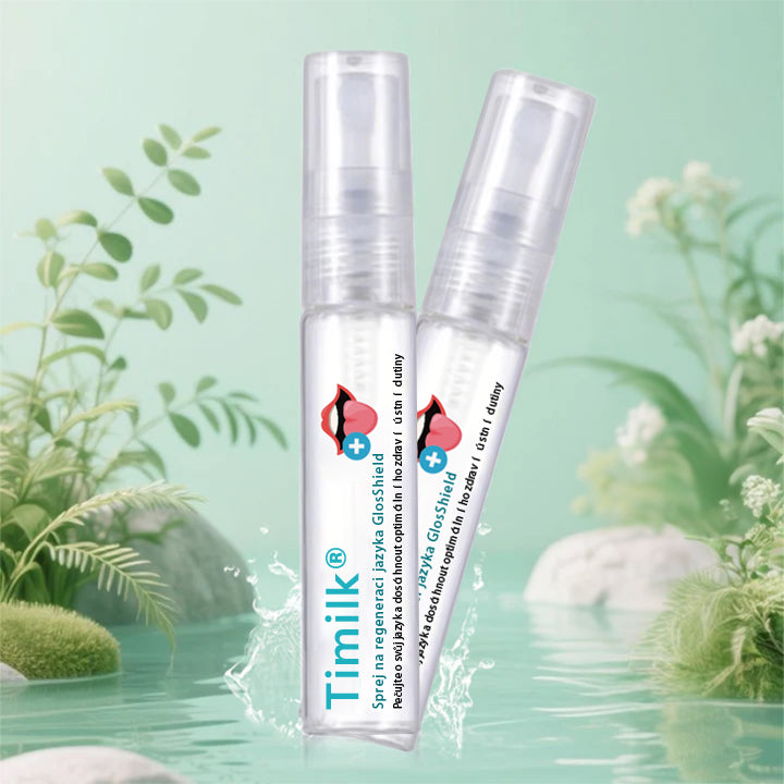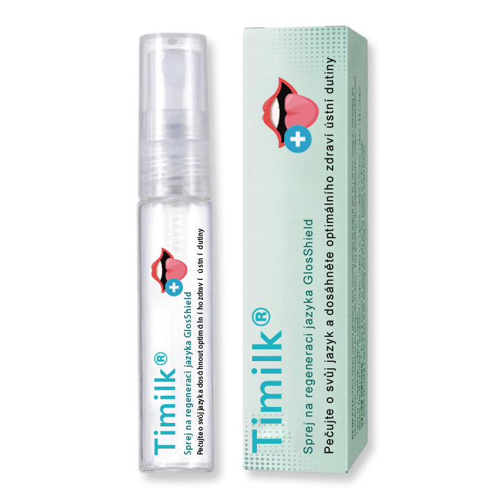 Sprej na jazyk GlosShield je speciálně vyvinutý pro zklidnění a nápravu zánětu jazyka, suchosti, bílého povlaku, bolesti a bakteriálního usazování způsobeného špatnou ústní hygienou, nutričními nedostatky, infekcí nebo chronickou suchostí. Sprej je poháněn rostlinným, nedráždivým složením, takže rychle proniká do povrchu jazyka a začíná působit během několika minut. Poskytuje hloubkovou hydrataci, antibakteriální účinky a podporu regenerace tkání – to vše bez štípání nebo dalšího poškození citlivé oblasti ústní dutiny. Toto rychle se vstřebávající složení účinkuje již za 3 minuty a klinicky prokázáno, že Timilk® GlosShield zlepšuje stav jazyka a snižuje nepříjemné pocity v ústech již během několika dnů používání. Při pravidelném používání je viditelné zlepšení často patrné již za jeden týden.