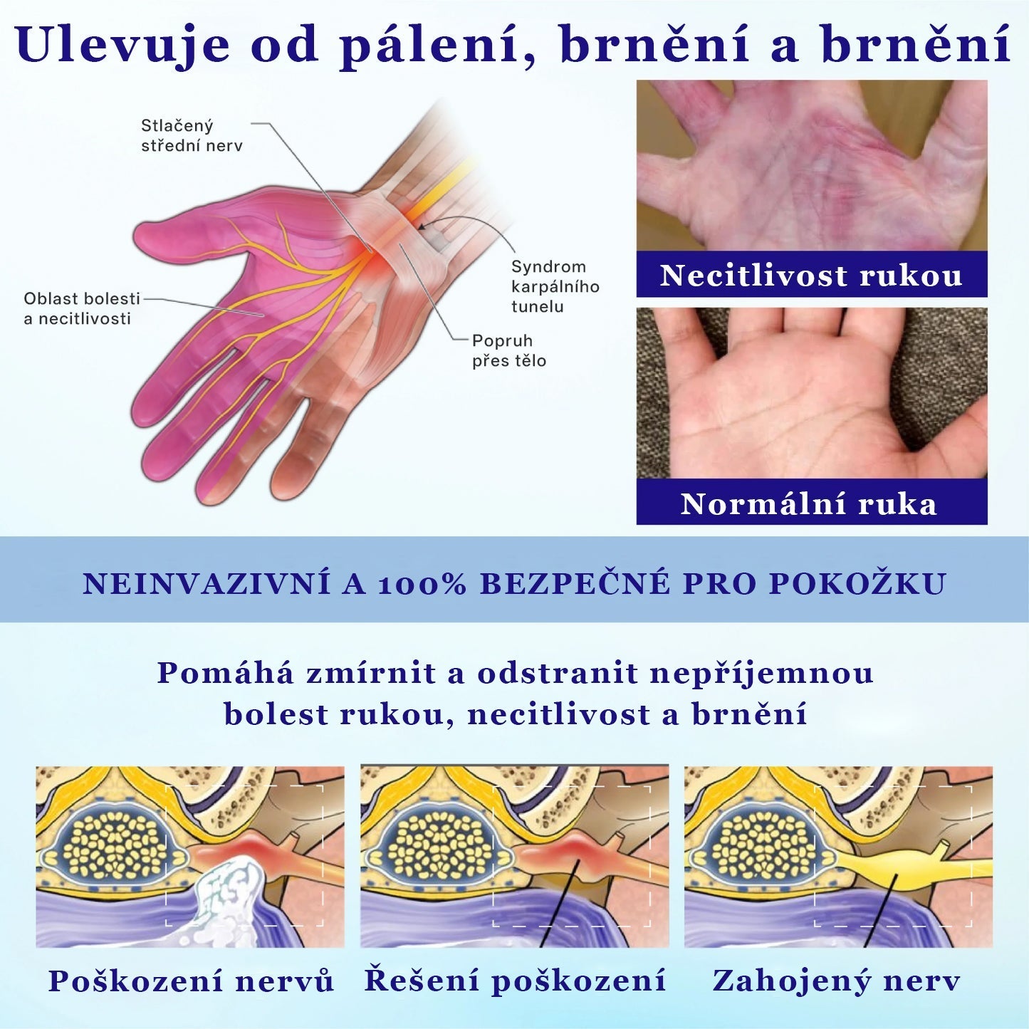 Jeho složení s dvojím účinkem proniká pod povrch, kde zklidňuje přecitlivělá nervová zakončení a přerušuje abnormální signály bolesti.