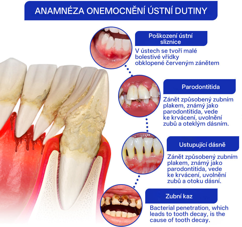 🧼 Léčí problémy v ústní dutině, jako jsou odolné skvrny, plak, ustupující dásně, krvácející dásně, oteklé dásně, zánět dásní a zápach z úst